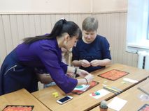 После праздничной программы присутствующие взрослые, выбрав цветной жетон, определяющий педагога мастер-класса, отправились за новыми знаниями и умениями.